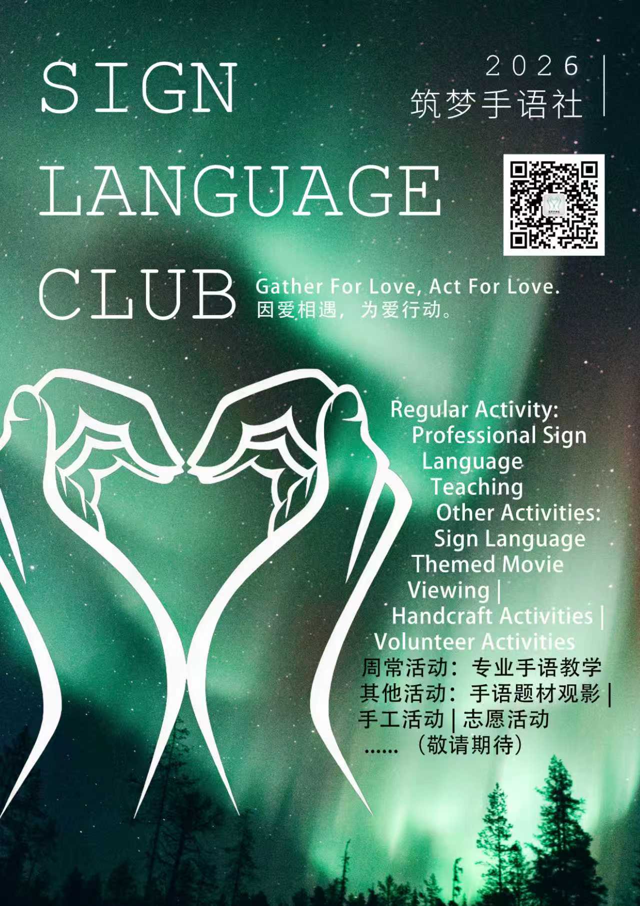 We aim to provide the chances for students to learn and communicate about sign language and we try to popularize it. We also try to call on every student to care about the people who cannot hear or speak and to love voluntary activites. To achieve our aims, we have regular sign language classes every week and other voluntary activities. Moreover, when the members have any interesting ideas about sign language or charity, we will support them and make the ideas come ture.